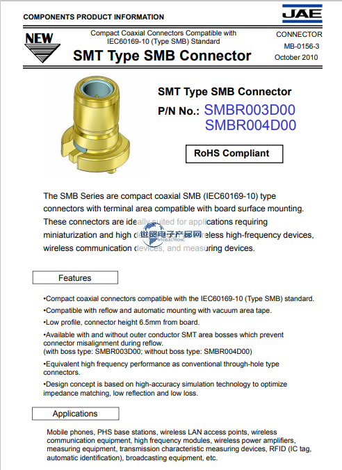 JAE|日本航空电子|JAE连接器SMB同轴连接器产品是一款:紧凑型同轴SMB(IEC 60169-10)型连接器,端子区域与板表面安装兼容。这些连接器非常适合于需要小型化和高密度的应用,例如无线高频设备、无线通信设备和测量设备。符合IEC 60169-10(SMB型)标准的紧凑型同轴连接器。兼容回流焊和真空区域胶带自动安装。外形小巧,连接器高度离板6.5毫米。可提供带和不带外导体SMT区域凸台的产品,可防止回流期间连接器错位。(带凸台类型:SMBR003D00;不带凸台型号:SMBR004D00)与传统通孔型连接器具有同等的高频性能。设计理念基于高精度仿真技术,以优化阻抗匹配、低反射和低损耗。